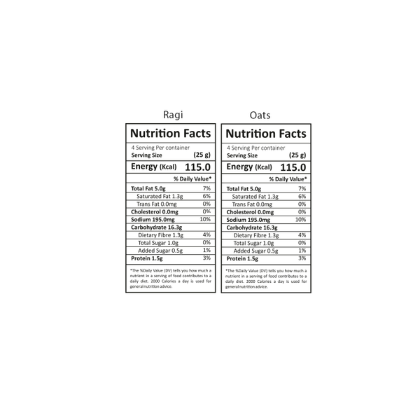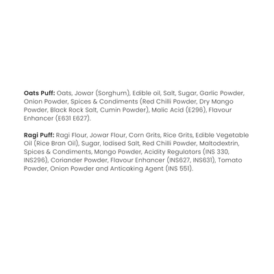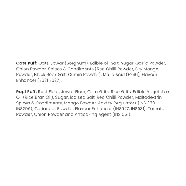 • Ingredients - Oats Puff - Oats, Edible Oil, Salt, Sugar, Garlic Powder, Onion Powder, Spices & Condiments (Red Chilli Powder, Dry Mango Powder, Black Rock Salt, Cumin Powder) Ragi Puff - Ragi Flour, Jowar Flour, Corn Grits, Rice Grits, Edible Vegetable Oil (Rice Bran Oil), Sugar, iodized Salt, Red Chilli Powder, Maltodextrin, Spices & Condiments, Mango Powder, Acidity Regulators (INS 330, INS296), Coriander Powder, Flavours Enhancer (INS627, INS631), Tomato Powder, Onion Powder and Anticaking Agent (INS 551).