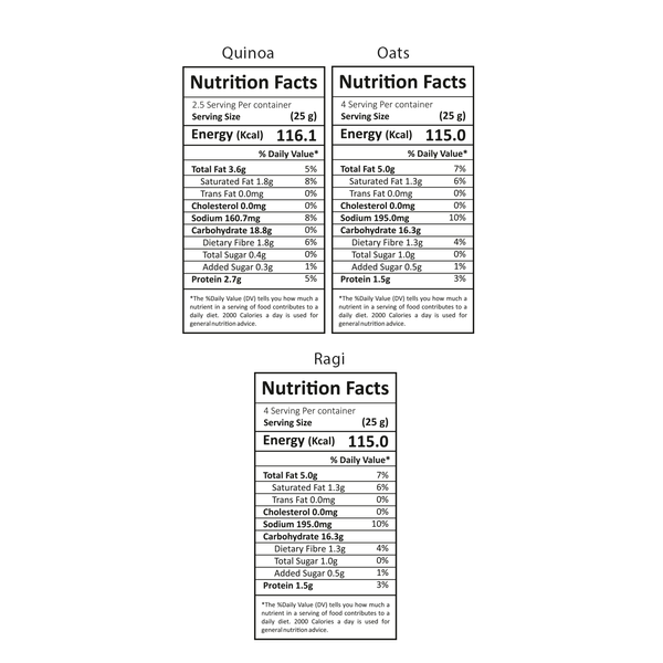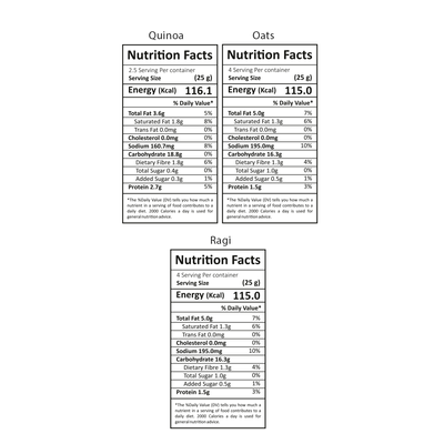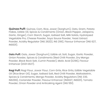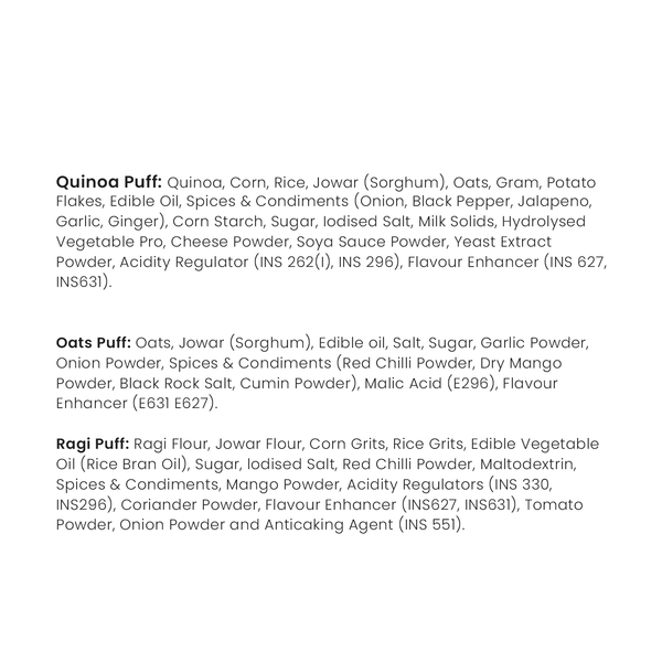 • Ingredients - Oats Puff - Oats, Jowar (Sorghum), Edible Oil, Salt, Sugar, Garlic Powder, Onion Powder, Spices & Condiments (Red Chilli Powder, Dry Mango Powder, Black Rock Salt, Cumin Powder) Quinoa Puff - Quinoa, Edible Oil, Salt, Sugar, Garlic Powder, Onion Powder, Spices & Condiments (Red Chilli Powder, Dry Mango Powder, Black Rock Salt, Cumin Powder), Malic Acid (E 296), Natural & Nature Identical Flavouring Substances, Spice extract Ragi Puff - Ragi Flour, Jowar Flour, Corn Grits, Rice Grits, Edible Vegetable Oil (Rice Bran Oil), Sugar, iodized Salt, Red Chilli Powder, Maltodextrin, Spices & Condiments, Mango Powder, Acidity Regulators (INS 330, INS296), Coriander Powder, Flavours Enhancer (INS627, INS631), Tomato Powder, Onion Powder and Anticaking Agent (INS 551).