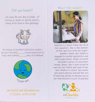 - Features - Upcycled, Handwoven, Waste Impact 35-45 less Plastic bags & wrappers, Livelihood Impact 1-2 days,