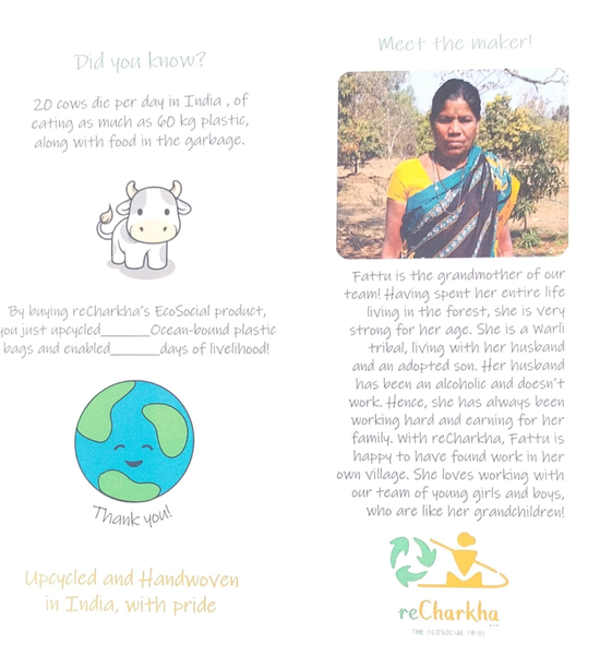 - Material - Outer Fabric reCharkha's UPCYCLED-HANDWOVEN fabric made from waste plastic Lining cotton fabric at the base and cotton piping along the edges.