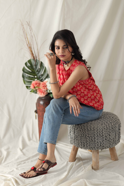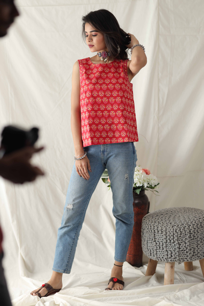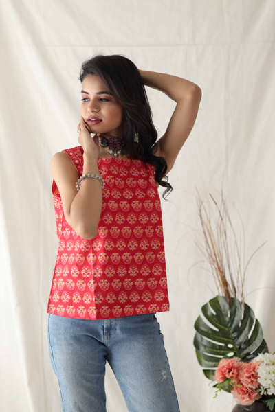 A CASUAL CROP TOP WITH BLOCK HAND PRINT CURATED FOR THE COMFORT AND FASHIONABLE LOOKS.