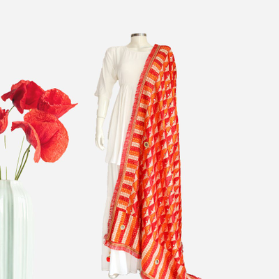 Colors of love, celebration, joy and blessings - all imbibed perfectly together on a red chiffon dupatta. Pinch of gold sequins and mirror work create an artistic delight to add an edge to otherwise heavily embroidered Phulkari with soft silky delicate thread work.