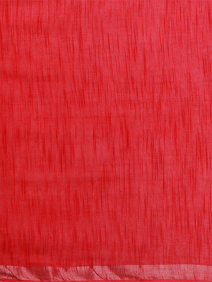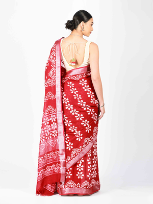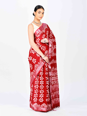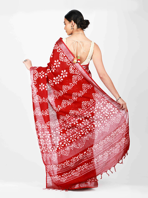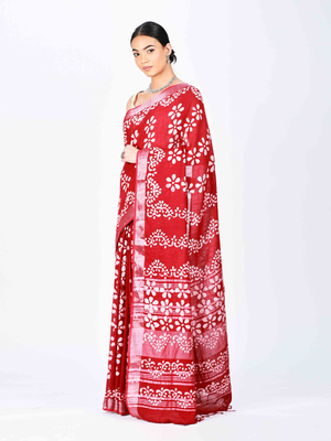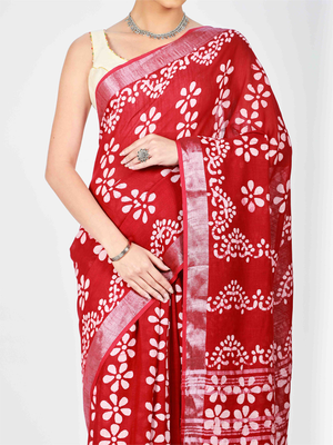Red linen saree with all over print and zari border. This saree has an all over abstract floral print on the body and pallu with floral patterns in zari work with tasseled border.