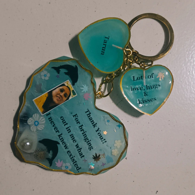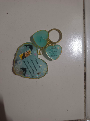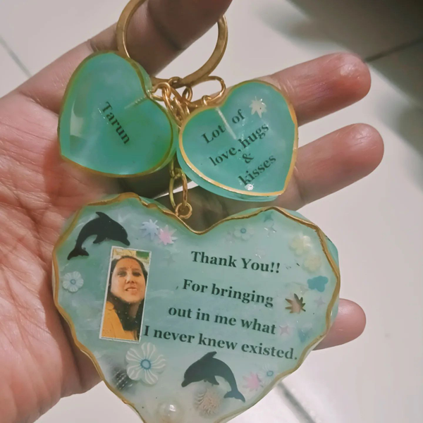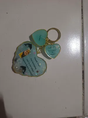 It sounds like you're interested in a resin heart-shaped keychain with a photo embedded in it. That can be a lovely personalized accessory. You could either try making one yourself using resin crafting supplies and a heart-shaped mold, or you might find such keychains available for purchase on various online platforms or craft stores. Just make sure to follow any instructions or guidelines for creating or purchasing such items.
