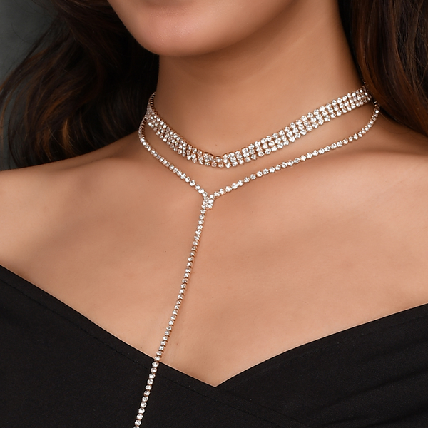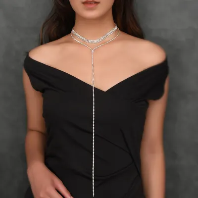 Elegant and exquisite: this drop design chain with crystals detailing is attached to a 0.8cm wide collar band choker necklace embellished with 3 rows of crystals. It takes on "Y" tassel shape on your neck. Has lobster clasp closure. Wear it with low necklines.