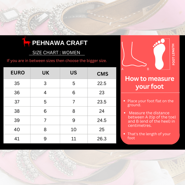 100% leather | Double cushioning | Handcrafted | Original Mandala ArtStonework & Ghungroo over the juttis are permanent and will not fade, run away even in moisture | water resistant and stylish look.All sizes are specified for small to medium feet width. Natural leather expands by about half an inch to take the shape of your foot after a week or two of wear.5-7 days estimated delivery timeCOD | Free delivery (India) | EMI options availableDesigned and handcrafted at PenhnawaCraft Studio, BangaloreHola! Get free Potli bag on all prepaid orders. Customization Available“Be Unique, Customize it” for colors, your name or add beautiful Add-ons.Click floating chat icon and send your custom preferences.Please note there will be extra charges for customization options.