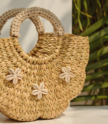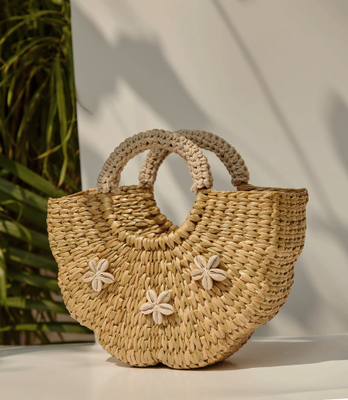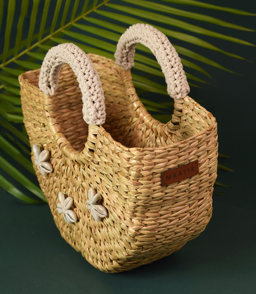 "The all natural handmade purse from Maatir completes your resort look. This natural straw handbag is made with kanua grass that grows in North East India. This purse is also known as a water hyacinth handbag and is woven by hand. This looks perfect as a beach bag or use it as a natural summer purse at a outdoor event or party. This designer straw bag is hand crocheted and finish with cowrie shells. This small handmade purse gives you a casual chic look. The grass handbag is sure to make heads turn. The kauna bag is varnished to give it a sheen and protect it from humid weather. The straw handbag from Maatir is elegant and classy. All natural, lightweight and elegant - this hand woven mini bag is perfect for a stroll down the beach or a pool party. The hand crocheted ivory handles give this bag a summery vibe. The bag is finished with a varnish with a tinge of gold, and this also make it a spot-on accessory for a resort or a destination beach wedding. The cowrie shells are from the Indian ocean – they add a coastal air to this bag. This handmade all-natural vegan bag is the perfect size for your phone and a few essentials. This bag is woven from dried Kauna grass that grows about 6 feet tall in the marshes of Eastern India. Handpicked by women, set to dry, then woven into bags, then crocheted with cotton yarn, and then embroidered with shells, this one bag packs in a lot of handmade love. "