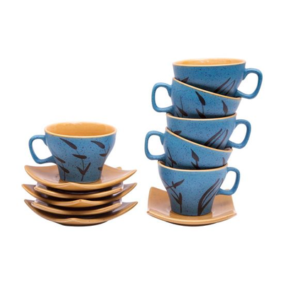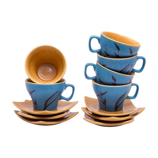 Shilpkara 'Leaf Sips' Studio Pottery Coffee Mugs Chai Sets Ceramic Tea Cups & Saucers Set (Blue, Pack of 12)