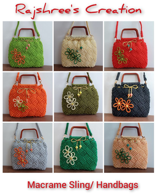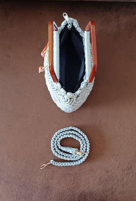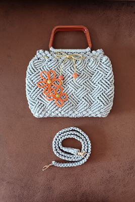 - Features - Detachable macrame belt with lobster hooks. Plastic moulded handle. Cotton lining with zip.