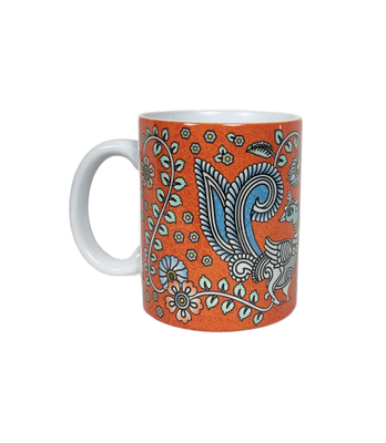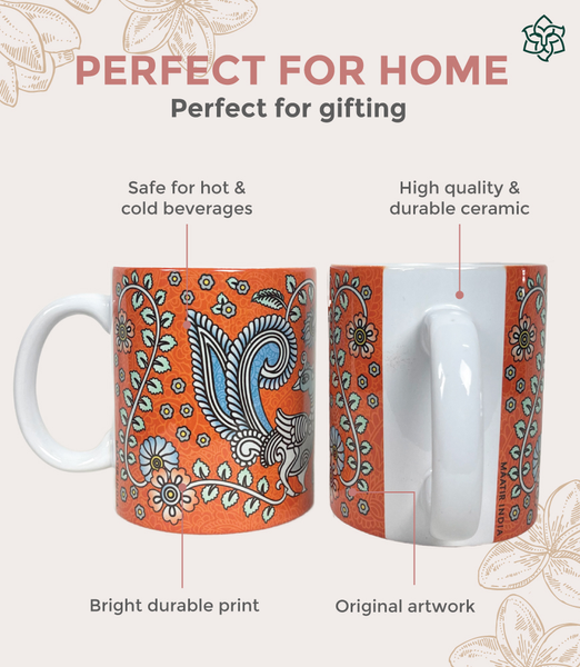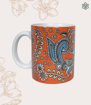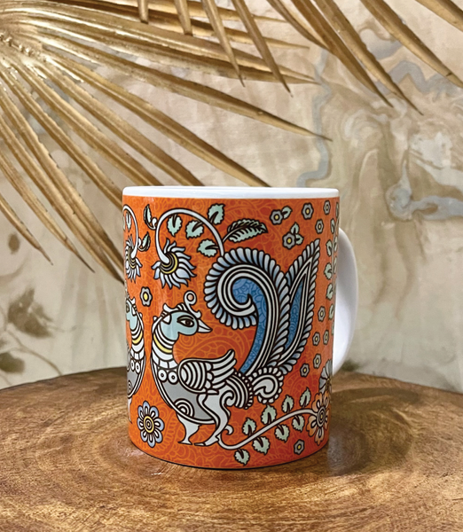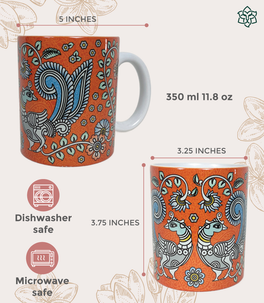 Decorated with traditional peacocks, the elegant design of this orange kalamkari art mug makes it the perfect