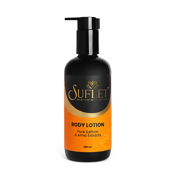 Suflet Body Lotion is loaded with skin loving ingredients. The Niacinamide helps to build skin protein and offers protection against environmental damage. Saffron offers protection against UV radiation and reduce hyperpigmentation. The Anti - aging Amla helps to achieve good skin tone.