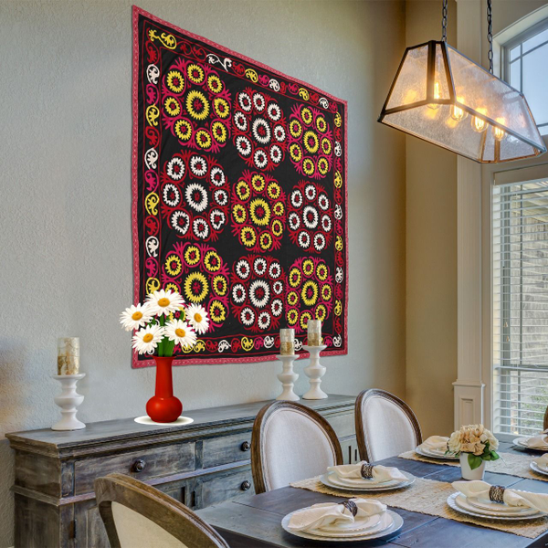 Ideally a suzani should be hung flat on a wall. Do not be tempted to wash them yourself, because they can be fragile.