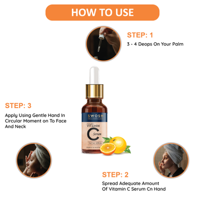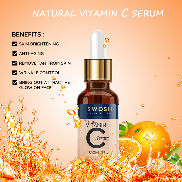 Swosh Vitamin C Serum is most concentrated lightening and stain reduction formula in a face serum.Benefit of Natural Vitamin C: Enriched with skin balancing ingredients, Swosh Vitamin C Brightening Serum will moisturize the skin and keep it soft after each Use. Make your complexion shine and shine with the powerful effects of vitamin C. It contains valuable natural and bio-active ingredients that help combat the signs of aging and standardize the complexion. It also supports the collagen structure of the skin, thereby enhancing the texture and appearance of the skin. It is suitable for all skin types.The combination of Orange Extract, Lemon Extract, Papaya Extract, Vitamin-C (Tamarind Seed Extract), Vitamin E combats pigmentation from damage to free radicals and oxidative stress. Penetrates the pores of the skin to reduce surface oil and impurities, reverse sun damage and provide a radiant, even complexion.This natural Serume contains gentle, pH-balanced that suit all skin types. Paraben & Silicone Free: All our products are completely free of Parabens and Silicones that may cause hormonal changes in the body.