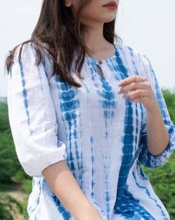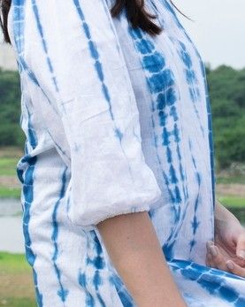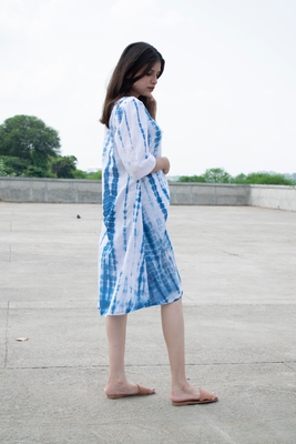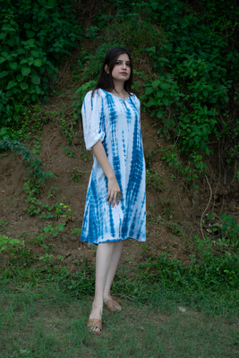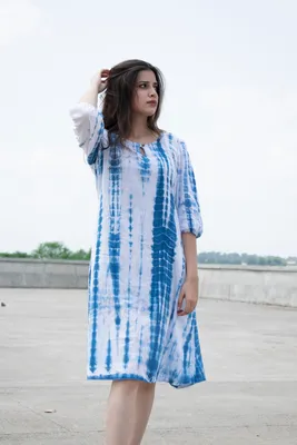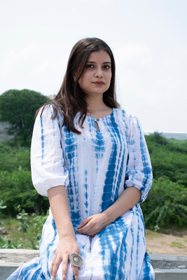 Charm shall follow your way in our elegant blue puff sleeve long dress with square neckline. The vivid tie dye is sure to set you a class apart. Tie dye is a resist dyeing technique which includes folding, tying of fabric with threads or clamps which when dyed results in varied coloured patterns. Every piece is made with perfection and fine tailoring so it will take almost 15 days to get it ready.