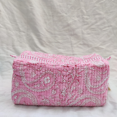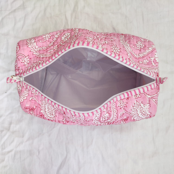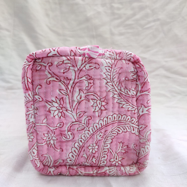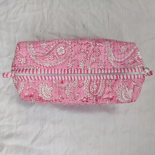 Cotton fabric is used in the outer and inner fabric. There is a fiber fabric between the two, so we have a fuller and softer makeup bag. Thanks to its cross stitches, the fiber fabric inside does not slip.
