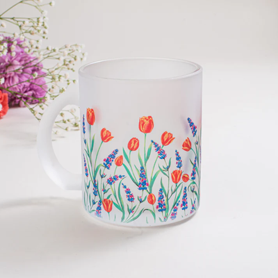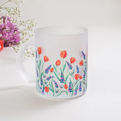 The Tulips and Lavender Frosted Glass Mug is one of our newest designs with refreshing tulip and lavender illustrations. This unique coffee mug can make a wonderful gift for your loved ones or a beautiful addition to your own collection.