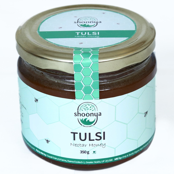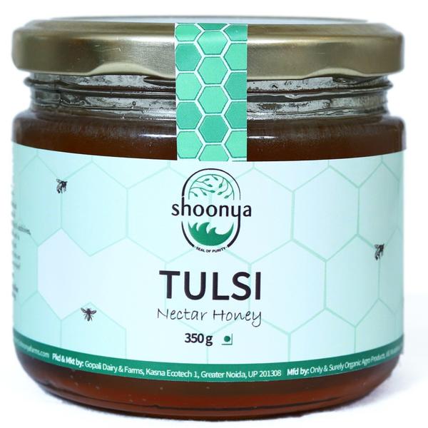Shoonya Tulsi Honey is collected from the expansive Tulsi plantations around Uttarakhand and UP. Tulsi is widely used plant for its medicinal & health benefits and its honey certainly imbibes some of its properties. Tulsi provides a huge boost to the immune system, which helps to fight a variety of infections. It also has anti-viral and anti-bacterial properties. Tulsi Honey is rich in antioxidants and may enhance overall health, help reduce stress. ● Consistency: Syrupy ● Color: Light amber ● Flavor profile: Fruity, fragrant flavor ● Pairing: Pair Tulsi Honey with a cup of warm water or herbal tea for maximum benefits DID YOU KNOW? Shoonya Tulsi Honey is NOT flavored honey! Our busy bees collect their nectar from the tulsi farms in Northern India. Note: Honey foam is natural and delicious! It contains bits of pollen, propolis, wax and raw honey trapped in air bubbles. Disclaimer: Natural honey tends to crystallize and can be liquefied by placing in hot water or sunlight. Care instructions: Store in a cool and dry place.