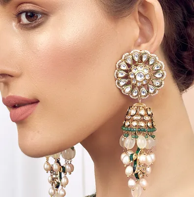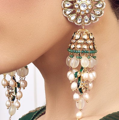 This Stunning Imitation Kundan Polki Style Bejewelled In Shell And Freshwater Pearls With Green Agate And Jade Will Surely Be A Real Steal Deal! Our Artisan Designers Vouch For Unmatched Quality Thanks To Our Premium Micron Gold Polish.