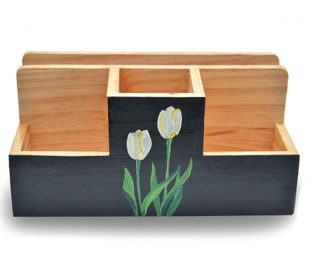 It has a sober pattern design. Our artisan has made a white petal flower on a dark background. It has 4 compartments; each one is of different size and depth. You can accommodate 3 good size books in the larger compartment. The other compartments are sufficient to give place to maximum number of items.