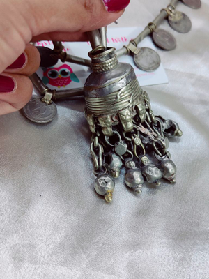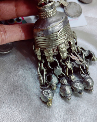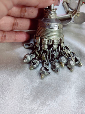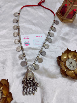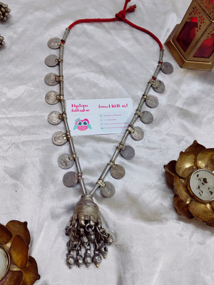 Handcrafted vintage Indian coin necklace with jhumka in the centre and vintage ghungroos at the bottom . This necklace is pre-owned by the kutchi tribal sourced and restored this 80 year old beauty into original form.