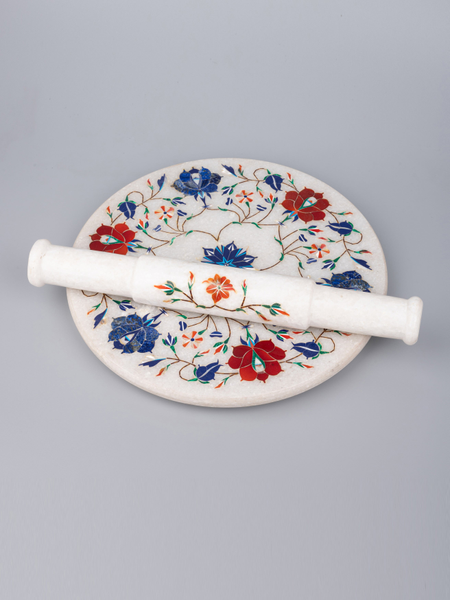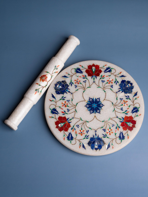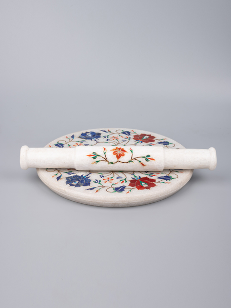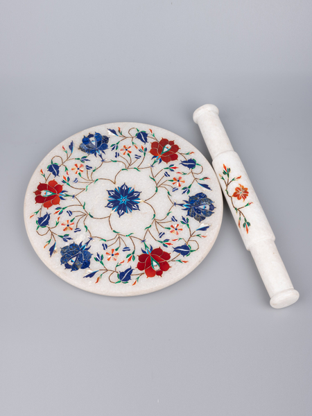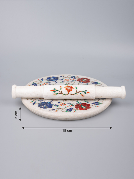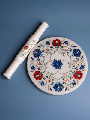 This white beautiful chakla belan set will jazz up your kitchen with its gorgeous & vibrant look. It is made of premium quality marble with inlay of semi precious stones and has got a very smooth finish to roll over any roti or pastry dough.