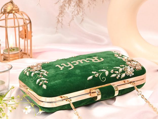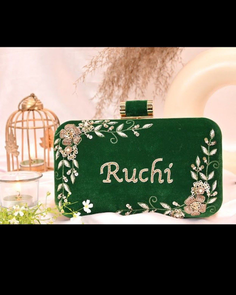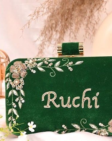 - Features - Handmade Name customised clutch bag Comes with a sling chain to carry Can be customised in colors and name Compliment your looks for parties and weddings with this beauty Share your customisation details with us on dm/whatsapp