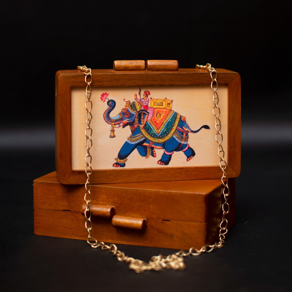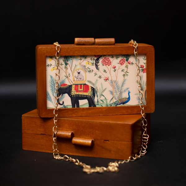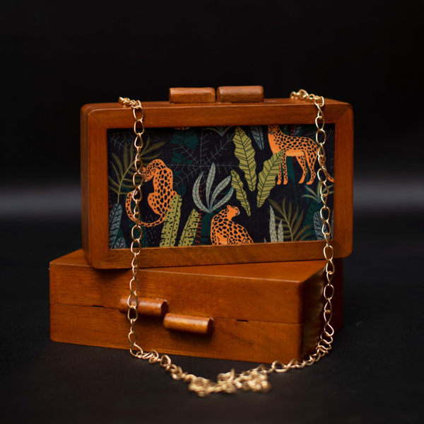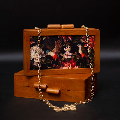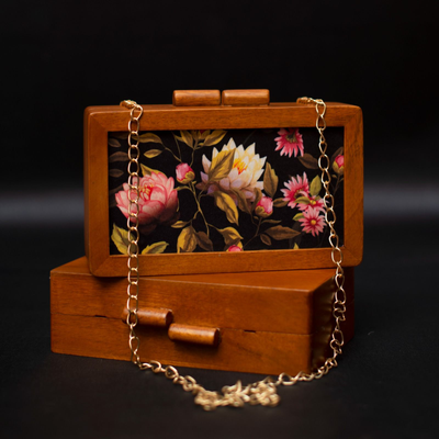 • Features -  *Best Selling Wooden Clutches with Printed Fabric Inside*   ➡️ Full body is made of Mango Wood ➡ Waist Length Sling Chain Included ➡️ Printed Fabric in front ➡️ Designer Wooden Knob & Magnetic Closure ➡ Size : 7.5x5x2 inch ➡ Light Weight ➡ Can fit phones of almost all sizes ➡️ One side printed fabric & other side plain wood