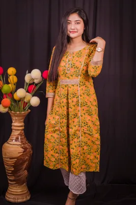 Yellow color floral print regular pure cotton kurti