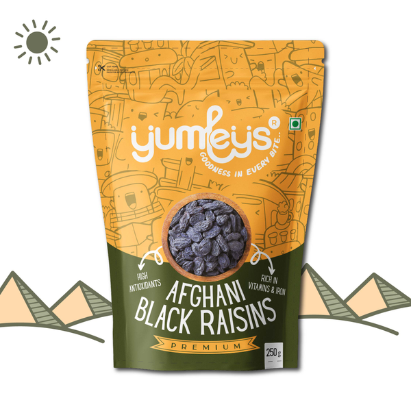 Sourced from Afghanistan: Yumleys' black raisins are meticulously handpicked from the fertile valleys of Afghanistan. They undergo natural drying processes before being thoughtfully sealed in resealable bags to preserve their freshness.