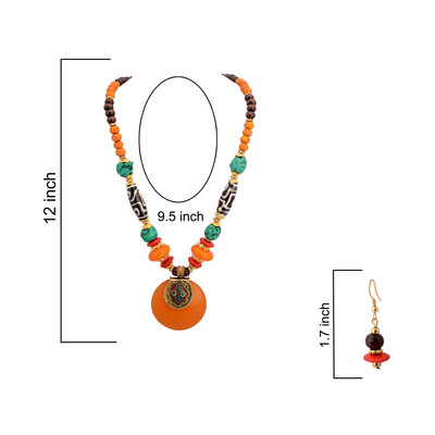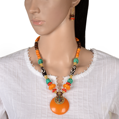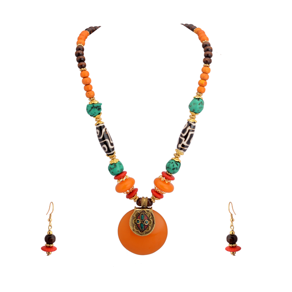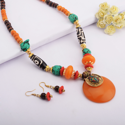 Zephyrr Saffron Tibetan Stone Dzi Beads Necklace Set With Earrings For Women(JAN-135)